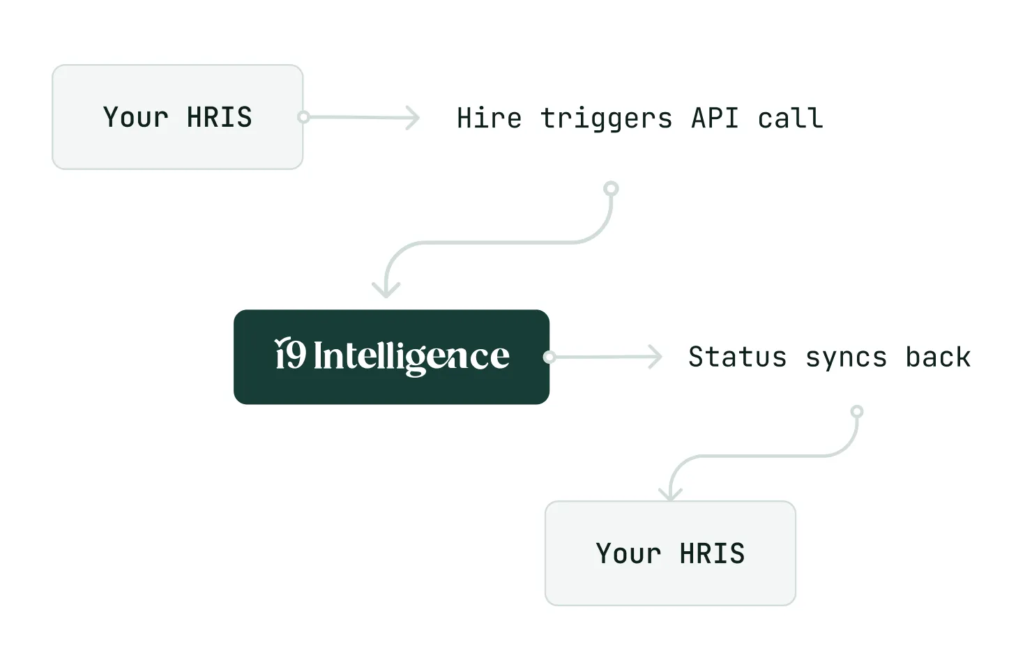 Our API connects your HRIS directly to the i9 Intelligence platform. When a new hire is confirmed in your system, the I-9 process starts automatically. Status updates sync back.