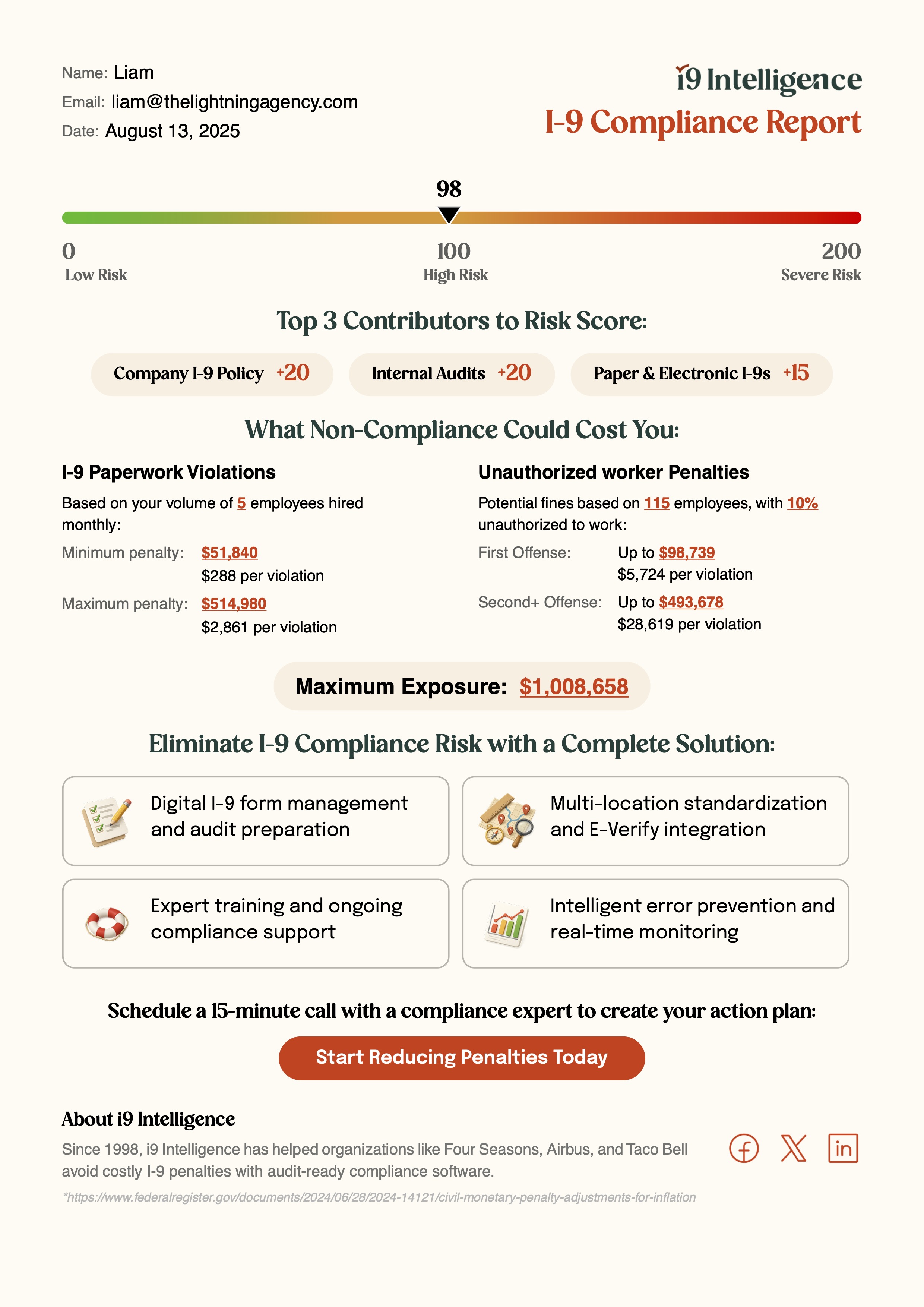Whether you're onboarding 1 or 1,000 employees, your I-9 process may be exposing you to costly penalties. In just a few clicks, you can uncover your compliance risk and get actionable recommendations tailored to your business.
