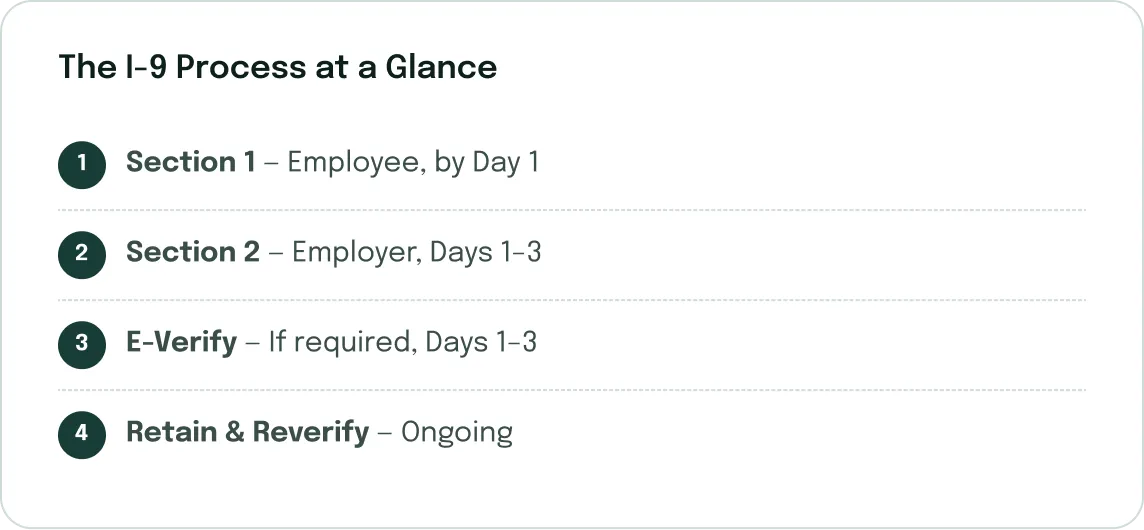 Every employer must follow these steps for each new hire. Missing any one of them is a potential violation.